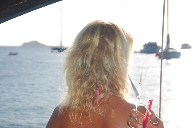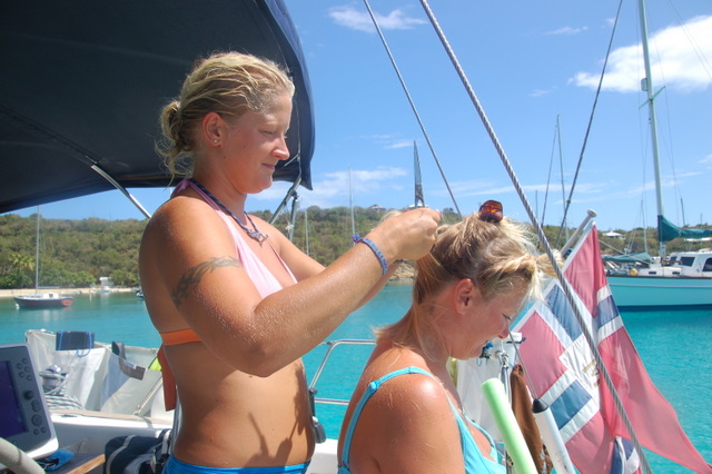 Etter Culerbra bestemte vi oss for en siste natt i Honeymoon Bay. Etterhvert kom både Tempest og Las Primas og flere norsk båter var på vei neste dag. Vi ble derfor to netter og fikk vært litt sammen med de norske båtene og ønsket god tur over havet igjen da noen av dem seiler tilbake til St Martin for å krysse derfra. Saga Tiba kom også til Honeymoon Bay og gjensynsgleden var stor. Amor Fati benyttet seg av klippetjenesten til Cecilie ombord i Las Primas, hun er nemlig frisør på hobbybasis og klipper store og små for en øl som betaling. Andrea og AC tok sjansen og er særdeles fornøyd med resultatet. Den tøffeste av alle, uten tvil, var Cecilie som lot seg klippe helt kort av Sten (Tempest) og Bente (Rattata)…Vi henviser til lasprimas.no for sluttresultat:)