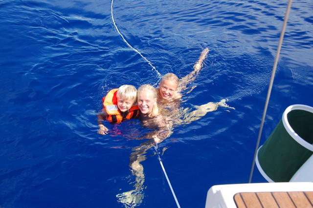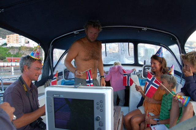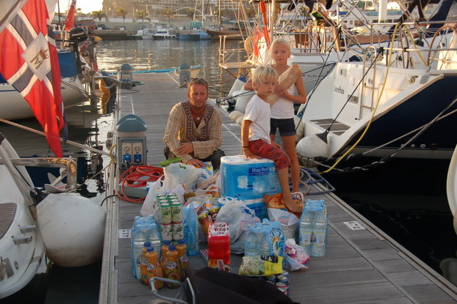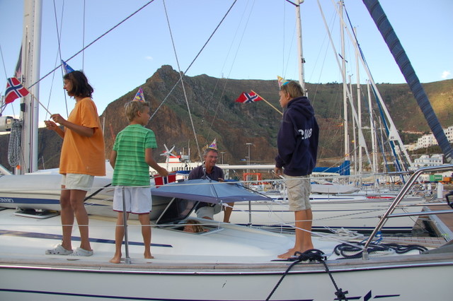Ja, nå nærmer det seg virkelig den store seilasen. Vi har ligget 15 dager i Mogan og det har vært deilig med mange dager i ro. Barna har gjort en god del skole, Gabriel har lært å svømme:) John har hatt en liten forsmak på julaften; Morten (Emblem) og Frode (Mango) har vært i Norge og vært så snille og kjøpe med endel utstyr til oss. Jeg har vel sjelden sett en mann så glad for noen skruer og lamper og pærer etc.:) Nå har vi lys i cockpit, nattlys og høytaler til VHF ute og jeg har fått ny redningsvest som forhåpentligvis ikke henger så veldig på nakken, får såå vondt i hodet av den gamle og gleder meg til å prøve den nye Spinnlock-vesten som sies å være bra. Vi har også kjøpt oss ett keramisk vannfilter så nå kan vi trygt drikke vannet fra tanken alle steder vi er. Ellers har jeg vært på Ikea i Mogan og gjort unna julehandelen/baksten for iår, det var fort gjort gitt; lilla adventslys, røde julelys, pepperkaker, sild og noen bilder som gjør det litt hjemmekoselig i båten. Pinnekjøttet er også på plass så nå går vi julen trygt i møte selvom vi mangler kålrabi da…kanskje det er noen som vil ta seg en tur og ta med noen til oss:)