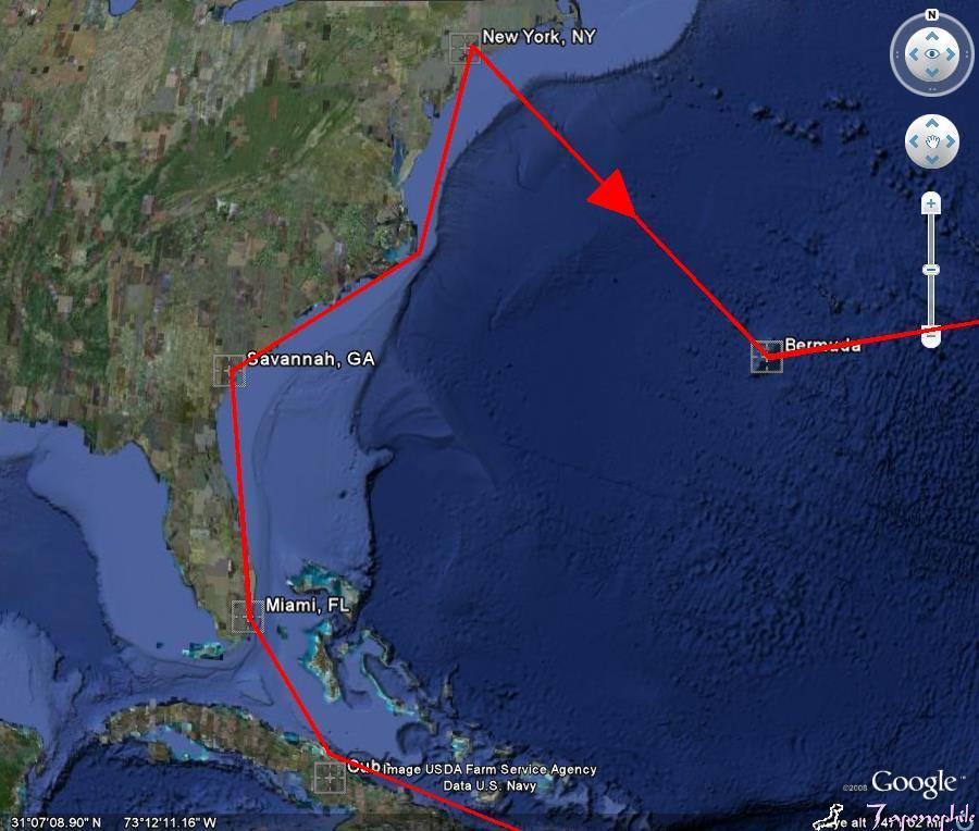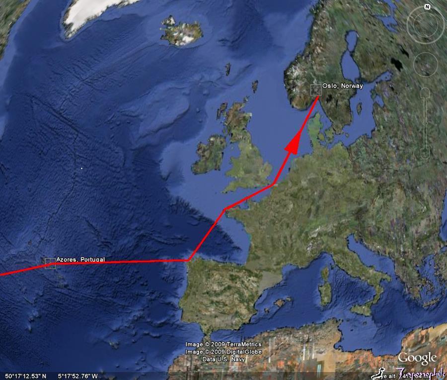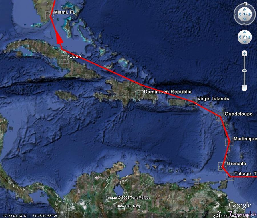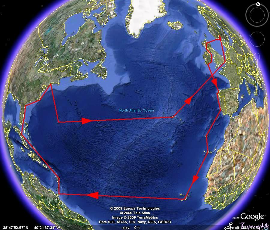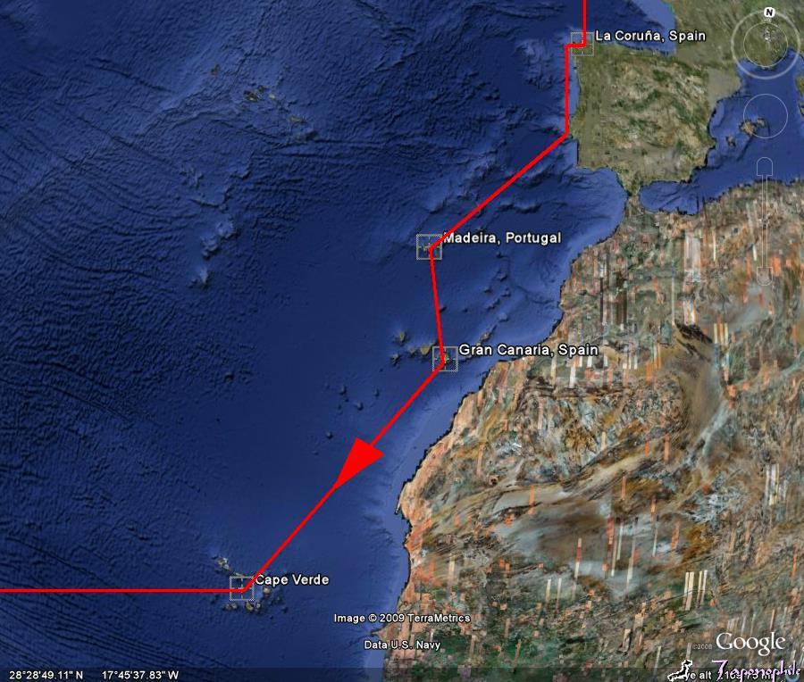 Langs Spania- og Portugalkysten. Ut til Madeira, videre til Kanariøyene og så Kapp Verde før overfarten til Karibien, omtrent Tobago. Deretter seiler vi nordover i Karibien, kanskje til Cuba, Florida og New York. Reiseruten kan bli forkortet.