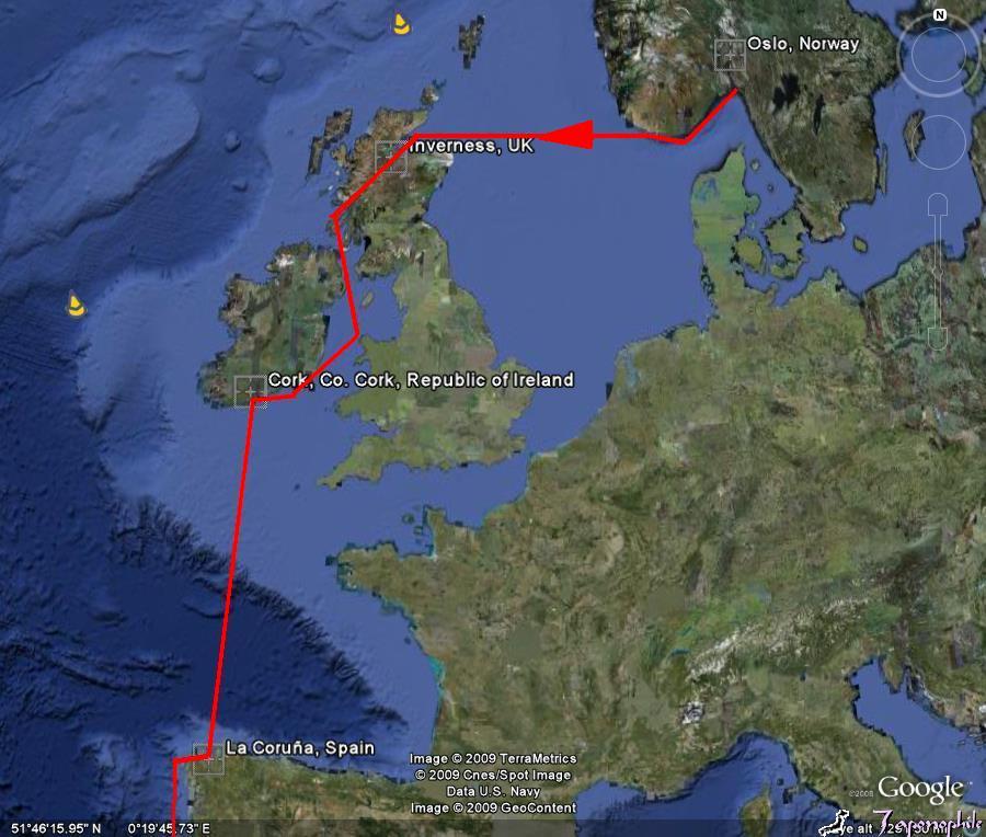 EL MAR forlater Oslo i slutten av juni og seiler ut fjorden. Vi plukker opp Ludvig og Sara i Arendal, etter Hovefestivalen, før vi runder Lindesnes og tar fatt på overseilingen til Skottland. Gjennom Caledonienkanalen over Loch Ness og Loch Lochy. Gjennom Irskesjøen til Cork. Over Biscayabukten før 15. august, til Coruña.