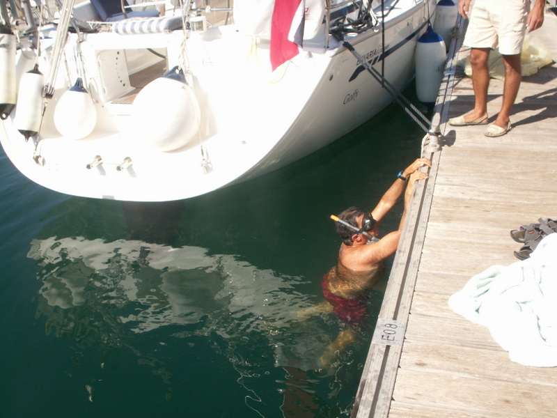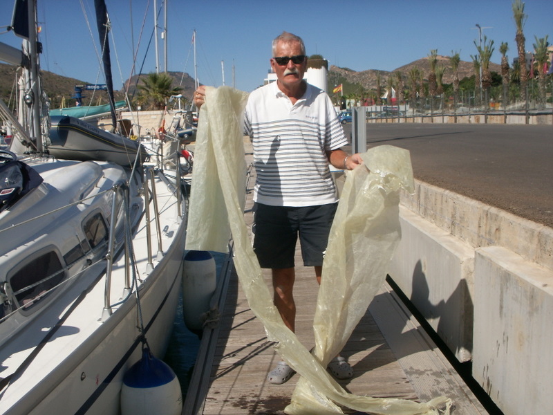 Etter frokost neste dag gikk vi ut av havna for å fortsette de siste 50 nm til Santa Pola. Plutselig begynte hele båten å riste og motoren skalv. Jeg slo av motoren med en gang. Hva skjer ? Startet igjen, men motoren bråkte og det var umulig å få koblet inn gir. Slo av motoren og  lot båten drive. Jeg unnlot flere forsøk med motoren og innså at jeg måtte ha hjelp til å taue båten inn i marinaen igjen. Jeg kalte opp og ble lovet assistanse. Båten hadde begynt å drive mot moloen.  ”Nå var gode råd dyre”. Opp med genoa og dermed styringsfart bort fra moloen med spisse steiner.(Glad vi ikke har motorbåt) Jeg hadde kikket ned i motorrommet og sett at det var sprutet olje rundt og en del olje hadde samlet seg i bunnen under motoren. Etter en stund ble vi tauet inn til trygg plass i marinaen og kunne puste lettet ut. Spørsmålet var : Var motoren ødelagt ? Var giret ødelagt ? Flere spørsmål svirret i hodet. Da vi kom til kai fortalte ”redningsmannen” at han hadde sett det hadde surret seg plastikk rundt propellen. Dykker ble rekvirert. Etter en stund kom han opp med en stor plastduk. Servicemann fra Volvo Penta kom til stedet og sjekket motor og gir. Det viste seg at en plugg i motoren var ristet løs pga vibrasjonen, slik at olje hadde sprutet ut. Ny plugg, etterfylling av olje i motor og gir, og   motoren gikk igjen som en klokke. Alt ordnet seg enklere enn jeg kunne drømme om da jeg kavet i havna uten motorkraft og oljesprut rundt motoren. (Plasten som satte seg i propellen var antagelig dekkplast fra tomatplantasje som hadde blås av i forbindelse med stormen)