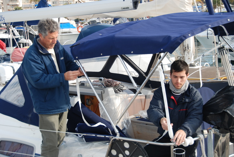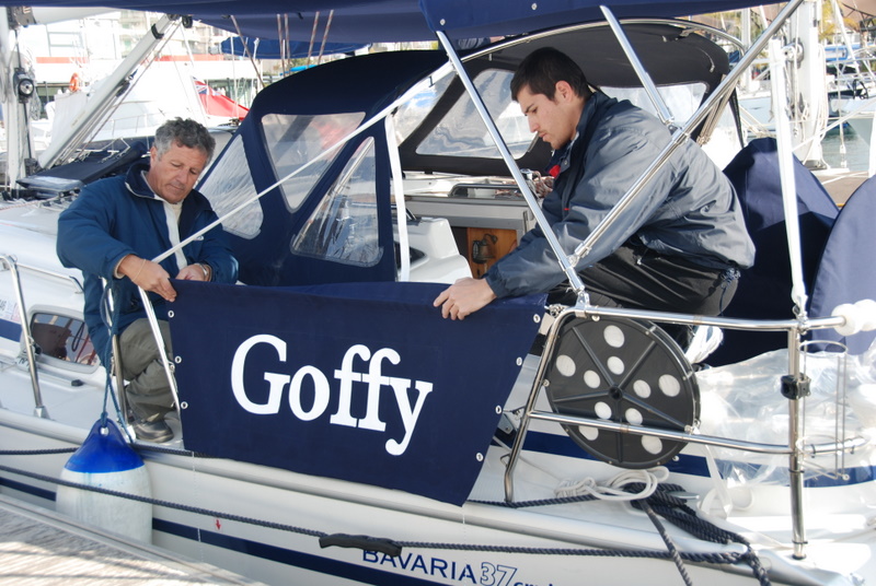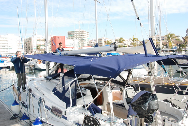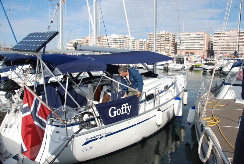 Da Torunn og jeg var i båten en ukes tid i november, bestilte vi bimini ++ som skulle monteres i januar/februar. Jeg tok turen til Santa Pola 1.2.11 for å møte seilmakeren. Da jeg kom ned til båten hadde han allerede rigget til bøylene. 2.2. kom som avtalt, 2 mann. Alt var ferdig og ble montert i strålende solskinn. Jeg må si jeg ble meget imponert når jeg så resultatet. GOFFY i store hvite bokstaver på rekketrekket på hver side etterlater ingen tvil om hvilken båt man observerer i det fjerne. Jeg ble meget imponert over arbeidet de har gjort. Prisen ? Det er ikke snakk om «norske priser». Jeg kan derfor anbefale dette firmaet til andre som er i eller har tenkt seg til dette farvannet, og trenger bimini, seil eller liknende. Gå inn på deres hjemmeside:  http://www.velassaez.com/