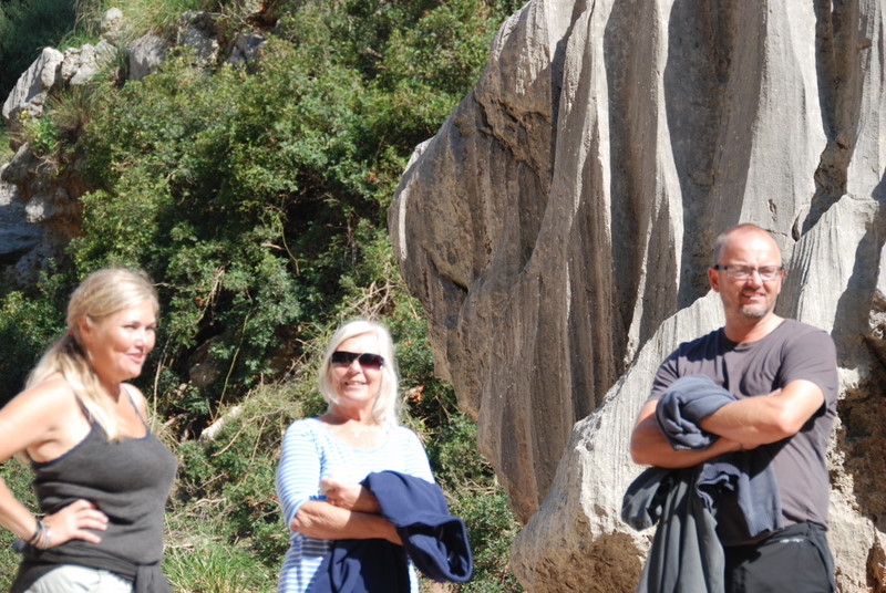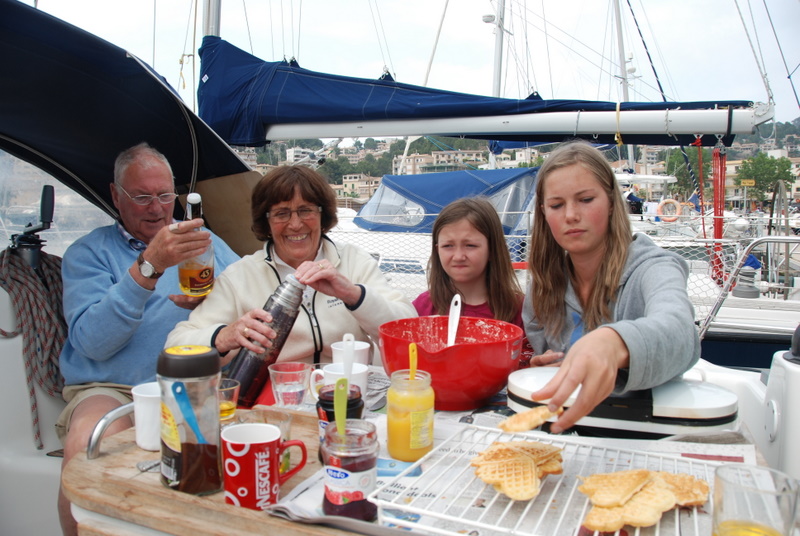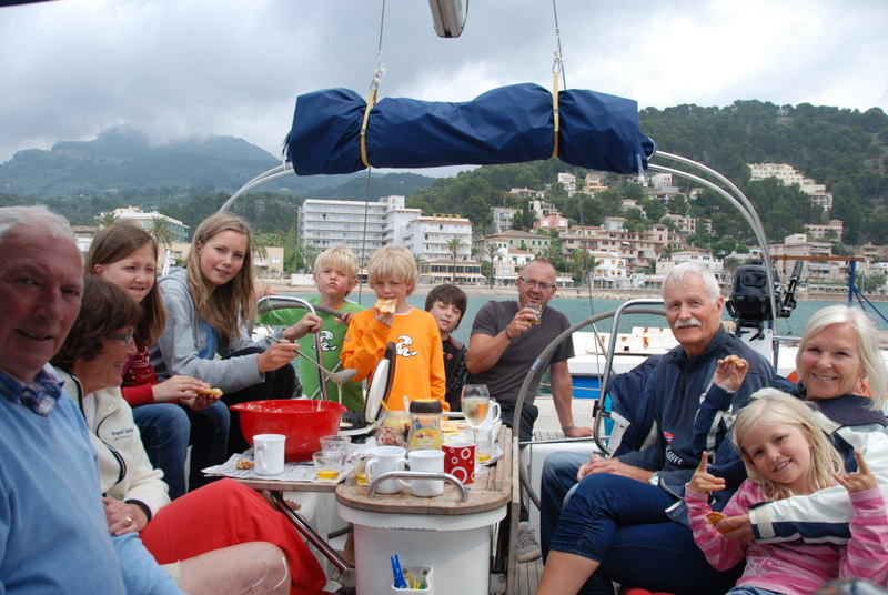 Utpå dagen lørdag kom barna til Turi og Mons, Harald, Sverre, Kristin og Johanne sammen med to venner, morfar og mormor. Barna hadde vært hos mormor og gofar på besøk i Palma Nova hvor de er på ferie.Om kvelden var det hyggelig samvær med bl.a. nystekte vafler om bord i UNO og deretter middag på Indisk restaurant. Søndag morgen kl. 0700 satte begge båtene kursen mot Cala de la Colobra, en lagune noen n.m. Nordover langs kysten.Vi la oss på svai utenfor en hvit strand med høye klippevegger på begge sider og lagune innenfor. Gummibåtene ble lagt på vannet i relativt store dønninger. Kursen ble satt mot stranda, noe som førte til at dønningene sørget for at vi ble skyllet på land mer eller mindre våte alle sammen. Etter at vi kom på land åpenbarte det seg en lagune med stupbratte klippevegger langt innover.Etter noen timer på land foretok vi noen halsbrekkende øvelser i dønningene for å komme om bord i gummibåtene. Mer eller mindre gjennomvåte kom alle seg velberget ombord d i UNO og GOFFY. Andre turister som var i lagunen filmet og fotograferte våghalsene som kastet seg ut i dønningene….Vel tilbake i Sòller måtte vi ta farvel med UNO som måtte tilbake til Andratx. Torunn og jeg takker hele familien Øye Rustøy for hyggelige dager på Mallorca. Håper vi sees igjen.PS. Harald: Din freezbee er tatt vare på og ligger i cockpit-bordet om bord i GOFFY. (GOFFY ligger på plass nr. 11). Senest får du den når dere kommer tilbake til Norge.