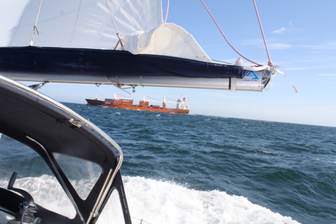 I strålende sol, shorts og T-skjorter, går for motor ut i ytre havn, der vi heiser seil. 08:13 kutter vi motoren utenfor og for bare storseilet med et rev, og setter kursen mot det søndre merket på Skagens rev. Dit ned er det 5 nautiske, som går unna på 37 minutter. Med andre ord det blåser friskt. Der nede vil vi ikke jibbe, så det blir en kuvending og vi kommer akkurat rundt i uten fokka. Den ruller vi ut på veien opp til det nordre merket på revet, og da spretter farten opp i over 8,5 kn, og er flere ganger over 9 med maks på 9,4 kn, i en frisk slør med vind fra vest. Når det merket er passert, legger vi kursen så høyt vi mener er riktig, for å få en pen seilas. Vi har som mål å komme til Kristiansand i dag. Det ser ikke lovende ut der og da, for, for ikke helt skarp kryss, det er det mest behagelige, er retningen 330 grader, og det blir mot Kragerø. Men det er lov å håpe at værmeldingen slår til i dag. Den sier vestlig vind om formiddagen, som etter hvert skal dreie mot syd og ende opp på sydøst.