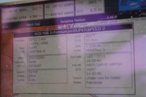 21:00 har vi kommet opp i stor nok fart, i en skarp slør og er redde for en broach, så vi ruller inn Zero. Allikevel øker farten, til over 8 knop i takt med vinden, som kommer opp i over 20 knop. Før innløpet til Kristiansand er vi mange ganger oppe i over 9 knop.