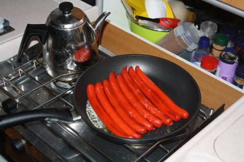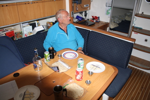 03:06 er dreggen ute inne ved Hånes, på østsiden av fjorden, og det blir skikklig anker-dram, før jeg begyner på den lenge, etterlengtede ”middagen”, som vi har fablet om i et halvt døgn. I dag har det gått i kjeks, salte og søte, og cola og lettøl, mens Erik også har fått i seg et anselig antall brødskiver. Tre kvarter senere er røde danske wienerpølser i lomper, med sennep, rå og stekt løk og rekesalat til kommet ned i våre tomme maver. Det er ok med to pølser til hver, for å gjøre oss mette.