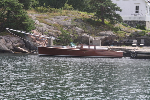 10:20 starter vi motoren, tre minutter senere er vi under-veis, og det skal ikke gå mange minuttene, før vi er ute for noe, som vi bør unngå. Vi følger tracket fra i går på vei ut av kilen, men i dag er det lavere vann enn i går, som gjør at vi halvveis ut smeller på en stein i 4 knop. Bråstopp er ikke bra, for da blir alt ombord presset forover, og det skjer med oss også. Jeg kjører haken i bøylen til bøylen cockpitteltet rett foran meg, men det er ikke det som bekymrer meg når båten har stoppet opp. Hvor er Gunnar? som jeg oppdager etter noen sekunder. Han holdt heldigvis i et tau, som han nå henger i, over trappen ned i salongen, med hodet ned og bena oppe utenfor nedgangen. Og jeg blir glad når han svarer at han har det bra. Erik på fordekket holdt seg også fast i grunnstøt¬ingen, så han klarte å holde seg på dekket. Ellers hadde det blitt turens første bad.
