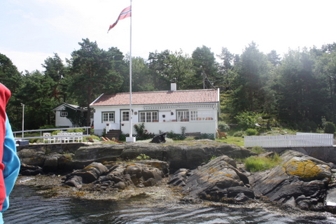 18:30 snakker jeg med Annemor igjen, og hun kan nå se oss fra stuevinduet sitt. Da ser vi så langt inne at vi må endre kursen til SØ, for å komme oss klar av Rakke¬båene, og 18:49 passerer vi rett innenfor Muleberget. Da er det bare paradeseilasen inn till Stavern, der vi inne på havnen tar ned seilene 19:31. Så er det å finne en bryggeplass hvor vi kan ligge litt for oss selv pga den fulle septiktanken. Jeg ser at det er tomt ved fiskemottaket og går inn dit. 19:40 ligger vi fortøyd, og jeg går opp på Fangst, for å spørre om de har et bord til fem om en times tid, og om vi kan ligge der til i morgen tidlig. De kan fortelle oss at det ikke kommer inn noen båter der i morgen tidlig, men bord kan de ikke holde av.
