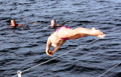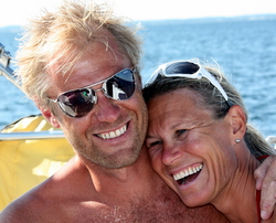 Det ble to rolige og kjempehyggelige dager på svai, med bading og tube. Med en badetemperatur på 23 grader, var det store badebassenget rundt båten flittig i bruk. Svømmekonkurransen rundt båten ble en strevsom affære med 1,5 knop motstrøm den ene veien. Henning kom stolt tilbake med et par rålekre selvlysende syntetsokker, etter at gutta hadde vært på tivoli med barna. Den 23. juli seilte hele gjengen 15 nm opp til Lohals på nordenden av Langeland, med to sykler bundet fast til rekka. Det skal litt til for å imponere bortskjemte nordmenn med skjærgård. Hvis vi skal gi en nøktern vurdering av de delene av det syd-fynske øyhav som vi var innom, så ble vi vel ikke helt sjarmert i senk. Vårt inntrykk er at øyene er frodige og ganske like, med mye vegetasjon og noen strender, og riktig nok hyggelige små landsbyer. I likhet med resten av vårt sandete naboland, så er det imidlertid ikke skjærgård slik vi kjenner det. Det er fint å ligge på svai i buktene, men ikke mulig å fortøye til land andre steder enn i havnene.