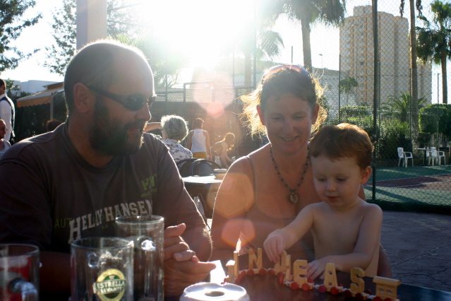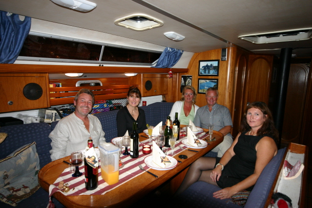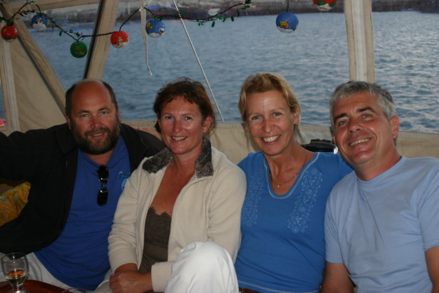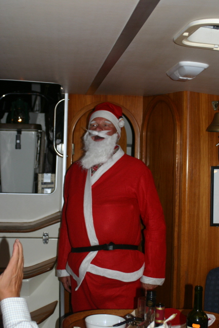 Julenisse ble det også utpå kvelden. Vi hadde en syv år gammel jente i en annen norsk seilbåt her i marinaen som var så bekymret for at nissen sikkert ikke ville finne henne siden hun var så langt hjemmefra, og så kom nissen allikevel. Der stod gleden i taket og hun var helt overbevist om at det var den virkelige nissen for hun kunne ikke se noe strikk som holdt sjegget på plass!