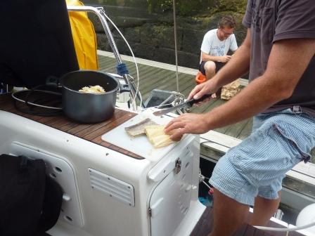 Etter å travet litt rundt fant vi en butikk, som hadde det vi trengte. Det regnet en del da vi kom tilbake i havnen, så vi begynte å tvile litt på opplegget. Vi møtte mange forventningsfulle blikk og kommentarer da vi var tilbake. Med litt rådslaging med Thomas fra Honning Pupp, som ble utpekt av skipperen til å være sjefskokk, ble vi enig om å sette igang.