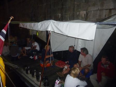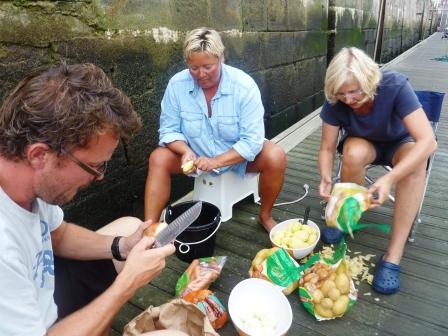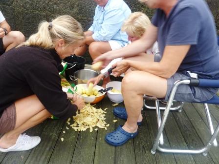 Vi satte frem råvarende for å komme i gang. Da strømmet det til med folk med drikkevarer og en hjelpene hånd. I løpet av en time med mye latter og litt drikke, sto fire store gryter klar for å settes på. Det ble satt opp et provisorisk telt eller tak på brygga, om det skulle komme regn i løpet av kvelden.