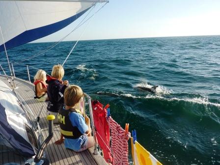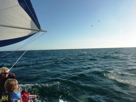 Mens vi lå i godt driv ser vi en flokk fugler som stupte mot sjøen og vi ble oppmerksom på noe var i ferd med å skje. Mot oss fosset det delfiner og omringet båten. Det må ha vært en flokk på 40-50 dyr og det var fantastisk å se dem leke rundt båten. Elise og Daniel satt på rekken og kunne nærmest føle at delfinene under beina. Skipperen tok bilder og filmet mens de var rundt oss. Etter en halv time var de vekk igjen.