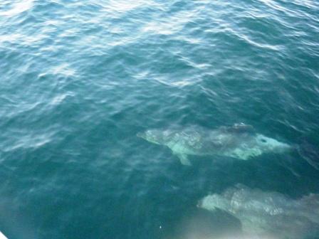 Vinden økte på og kom fra NV så det ble besluttet å sette opp spinnakeren. Båten beveget seg fint i sjøen og det er et flott syn når spinnakeren står. Vi fikk underveis besøk av delfiner som lekte rundt båten i 30 min. tid. Elise og Daniel frydet seg like mye som skipperen på synet at de vakre dyrene.