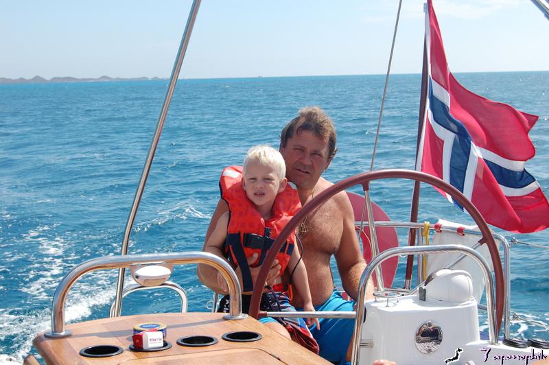 Skippern er førnøyd med å ha Sander på besøk. Sander spørr og graver om alt mulig… Store muligheter for at dette kan bli en ny skipper om noen år 🙂